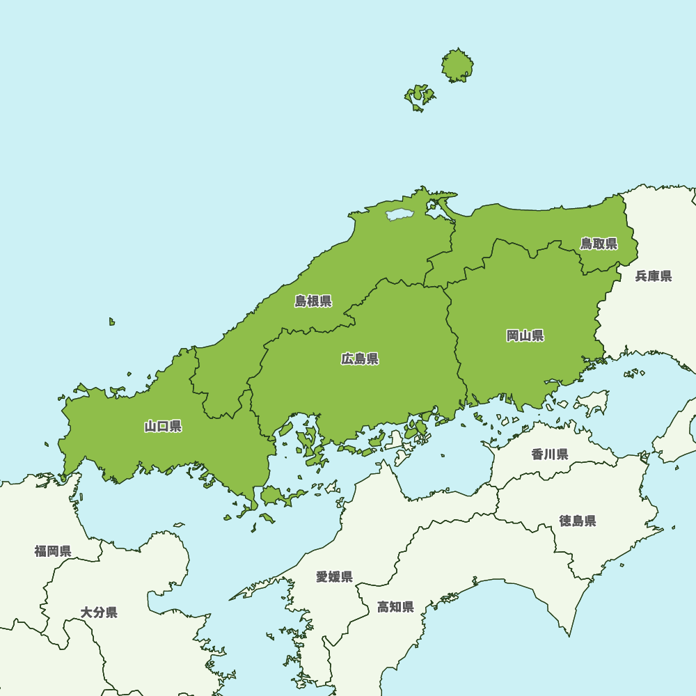 中国地方の地図を表示します。 マップ・イットは、地図素材や白地図が無料でダウンロードできるサイトです。印刷やWebなどの素材として商用利用できます。対応する地域は日本全域、八地方区分、47都道府県、政令指定都市、特別区、市町村です。