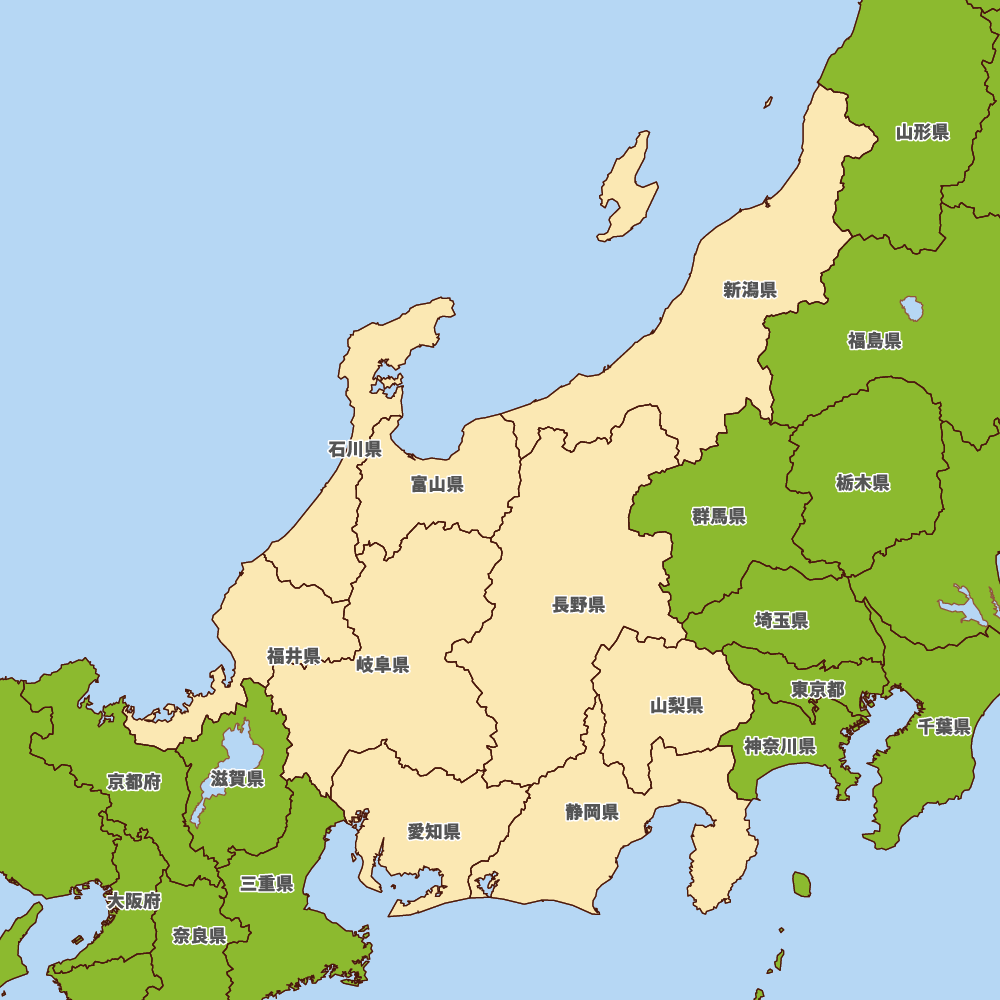 中部地方の地図を表示します。 マップ・イットは、地図素材や白地図が無料でダウンロードできるサイトです。印刷やWebなどの素材として商用利用できます。対応する地域は日本全域、八地方区分、47都道府県、政令指定都市、特別区、市町村です。
