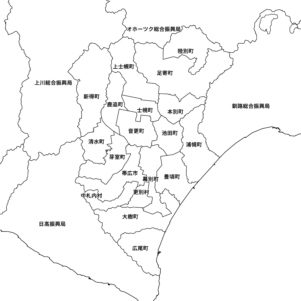 北海道十勝総合振興局の地図を表示します。 マップ・イットは、地図素材や白地図が無料でダウンロードできるサイトです。印刷やWebなどの素材として商用利用できます。対応する地域は日本全域、八地方区分、47都道府県、政令指定都市、特別区、市町村です。