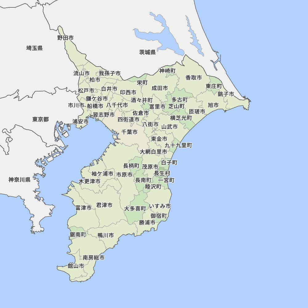 千葉県の地図を表示します。 マップ・イットは、地図素材や白地図が無料でダウンロードできるサイトです。印刷やWebなどの素材として商用利用できます。対応する地域は日本全域、八地方区分、47都道府県、政令指定都市、特別区、市町村です。