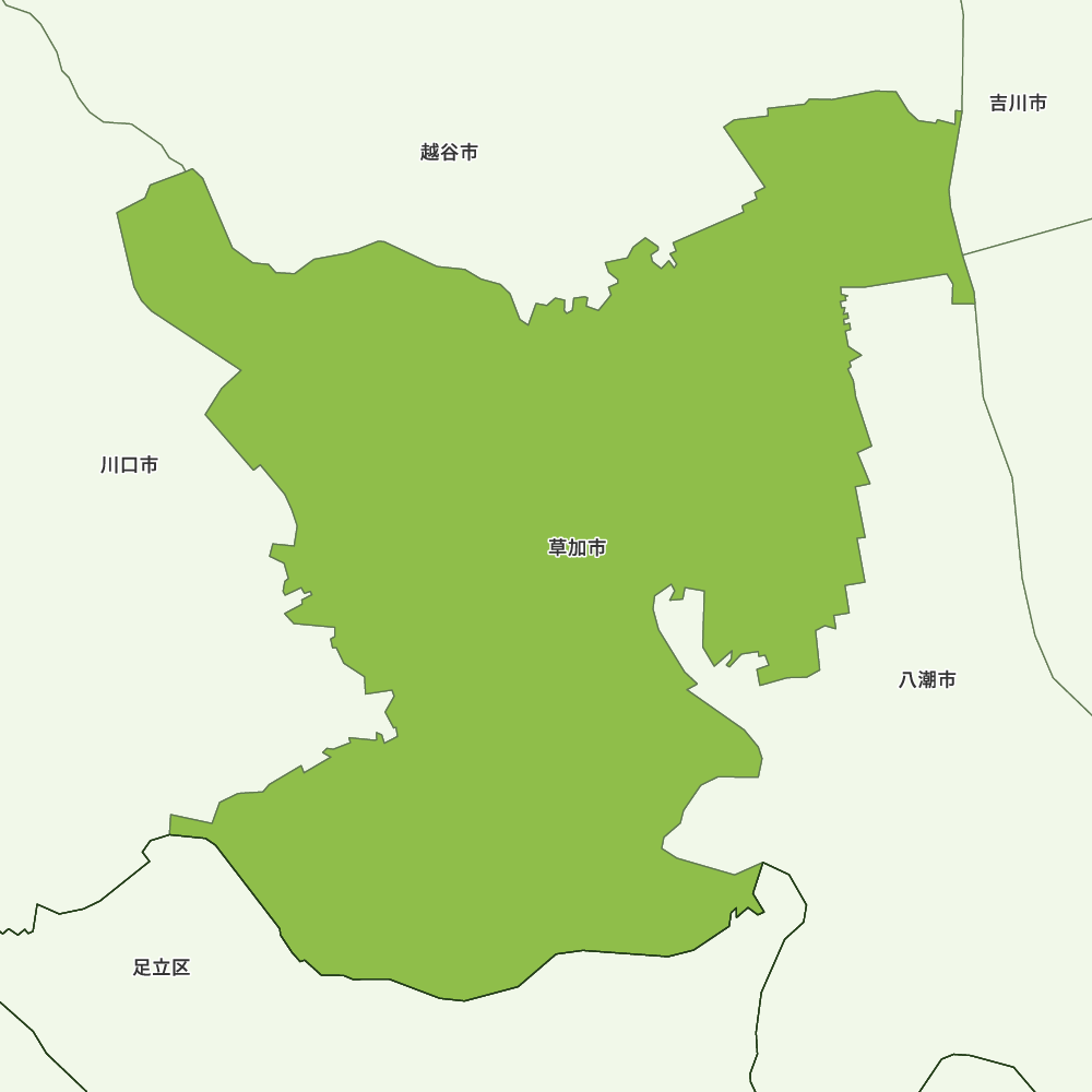 草加市は、埼玉県南東部に位置する人口約25万人の市。さいたま市、川口市、川越市、所沢市、越谷市、に次いで県内6位の人口を有する。施行時特例市。南側を東京都足立区と接する。草加松原や草加煎餅で知られる。