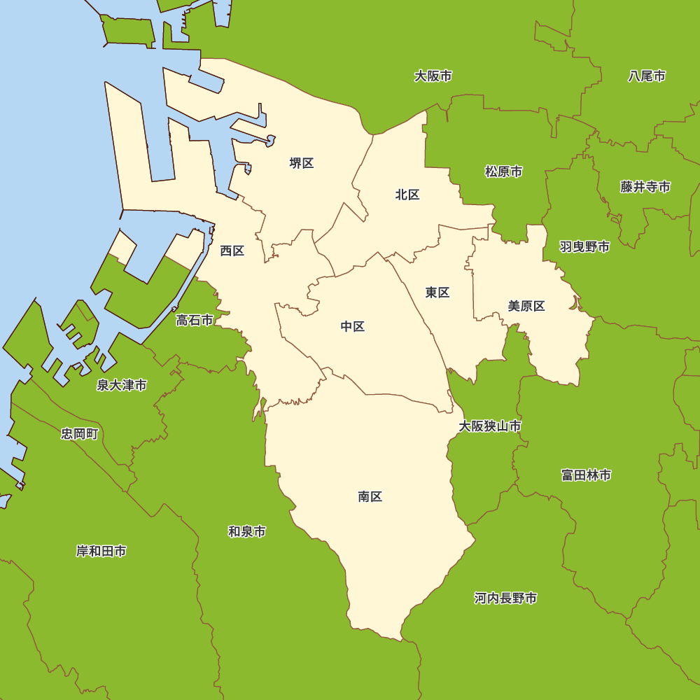 大阪府堺市の地図を表示します。 マップ・イットは、地図素材や白地図が無料でダウンロードできるサイトです。印刷やWebなどの素材として商用利用できます。対応する地域は日本全域、八地方区分、47都道府県、政令指定都市、特別区、市町村です。