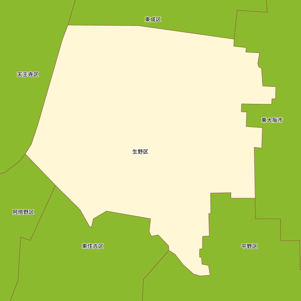 大阪府大阪市生野区の地図を表示します。 マップ・イットは、地図素材や白地図が無料でダウンロードできるサイトです。印刷やWebなどの素材として商用利用できます。対応する地域は日本全域、八地方区分、47都道府県、政令指定都市、特別区、市町村です。