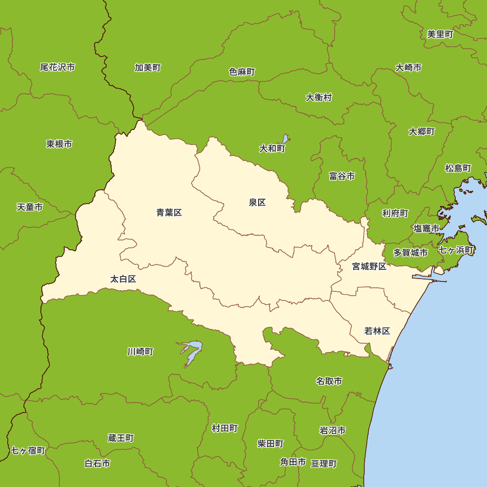 宮城県仙台市の地図を表示します。 マップ・イットは、地図素材や白地図が無料でダウンロードできるサイトです。印刷やWebなどの素材として商用利用できます。対応する地域は日本全域、八地方区分、47都道府県、政令指定都市、特別区、市町村です。