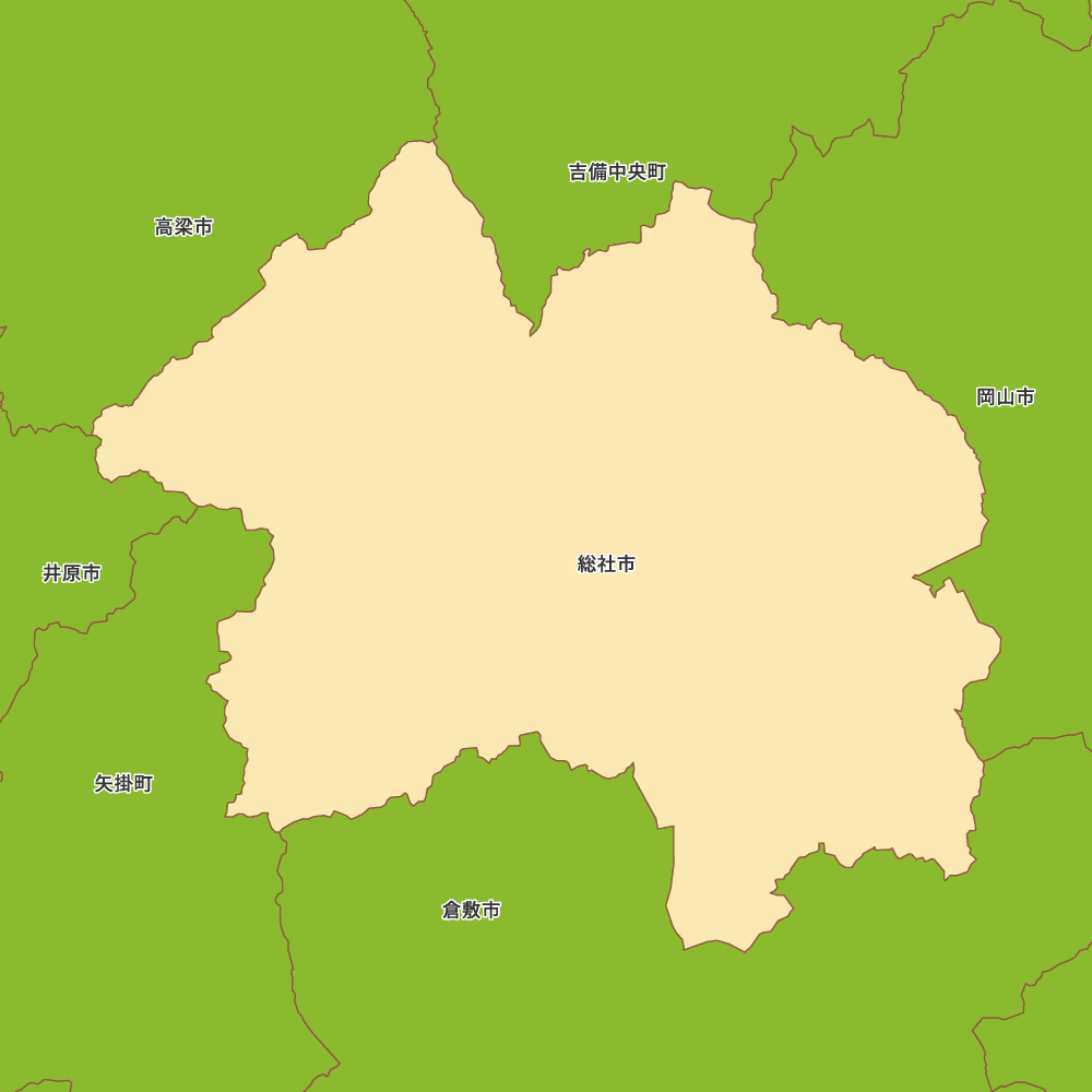 岡山県総社市の地図を表示します。 マップ・イットは、地図素材や白地図が無料でダウンロードできるサイトです。印刷やWebなどの素材として商用利用できます。対応する地域は日本全域、八地方区分、47都道府県、政令指定都市、特別区、市町村です。