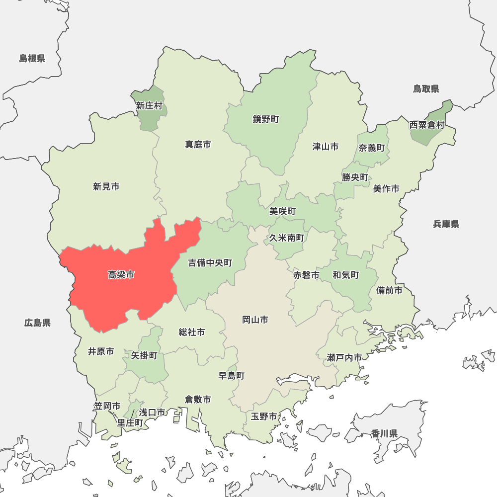 岡山県高梁市の地図を表示します。 マップ・イットは、地図素材や白地図が無料でダウンロードできるサイトです。印刷やWebなどの素材として商用利用できます。対応する地域は日本全域、八地方区分、47都道府県、政令指定都市、特別区、市町村です。