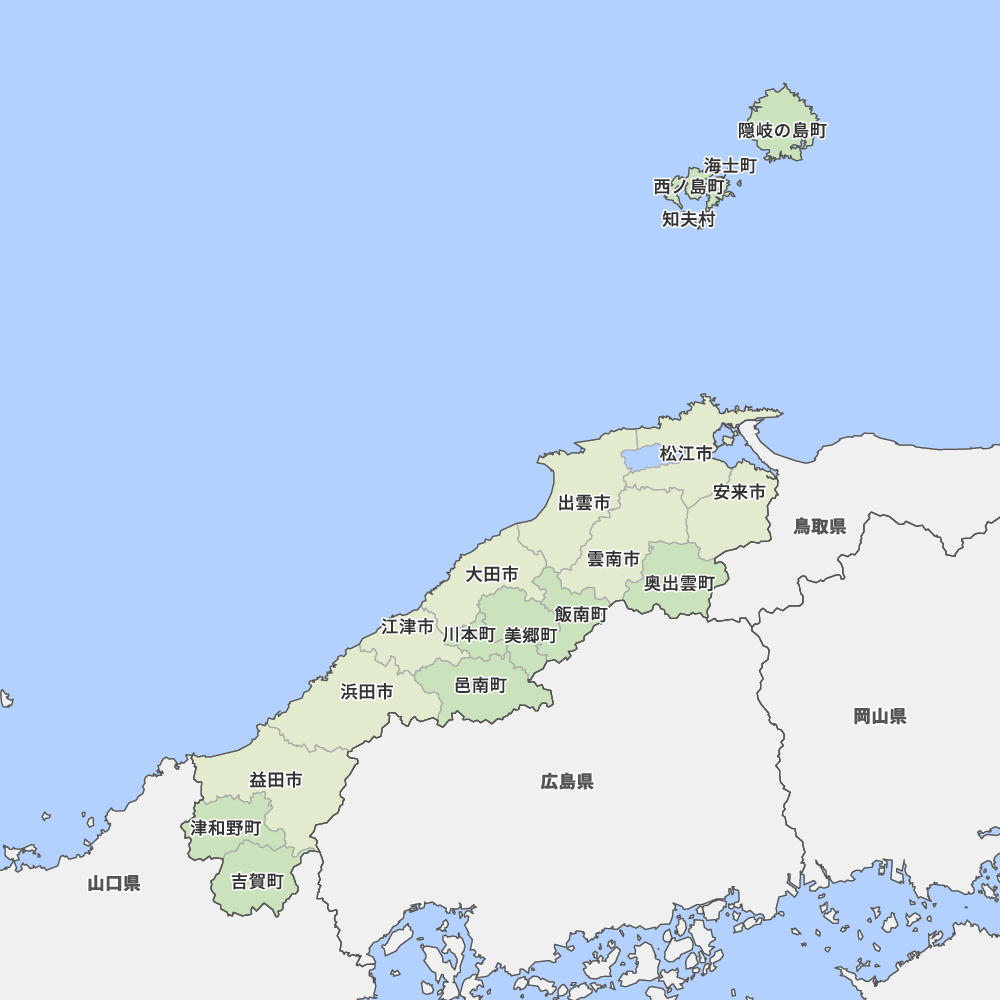 島根県の地図を表示します。 マップ・イットは、地図素材や白地図が無料でダウンロードできるサイトです。印刷やWebなどの素材として商用利用できます。対応する地域は日本全域、八地方区分、47都道府県、政令指定都市、特別区、市町村です。