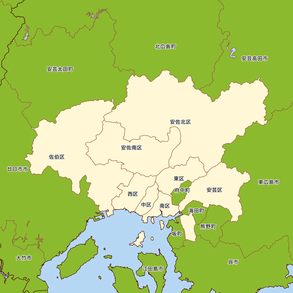 広島県広島市の地図を表示します。 マップ・イットは、地図素材や白地図が無料でダウンロードできるサイトです。印刷やWebなどの素材として商用利用できます。対応する地域は日本全域、八地方区分、47都道府県、政令指定都市、特別区、市町村です。