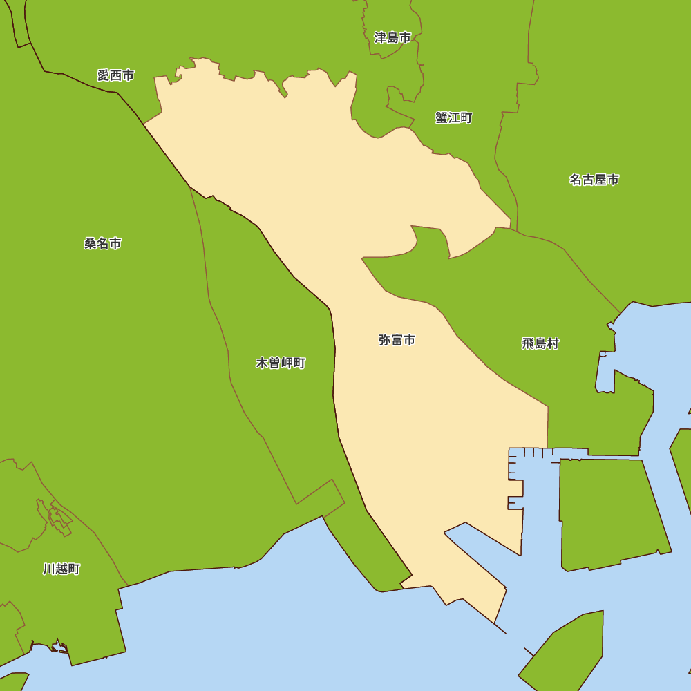 愛知県弥富市の地図を表示します。 マップ・イットは、地図素材や白地図が無料でダウンロードできるサイトです。印刷やWebなどの素材として商用利用できます。対応する地域は日本全域、八地方区分、47都道府県、政令指定都市、特別区、市町村です。