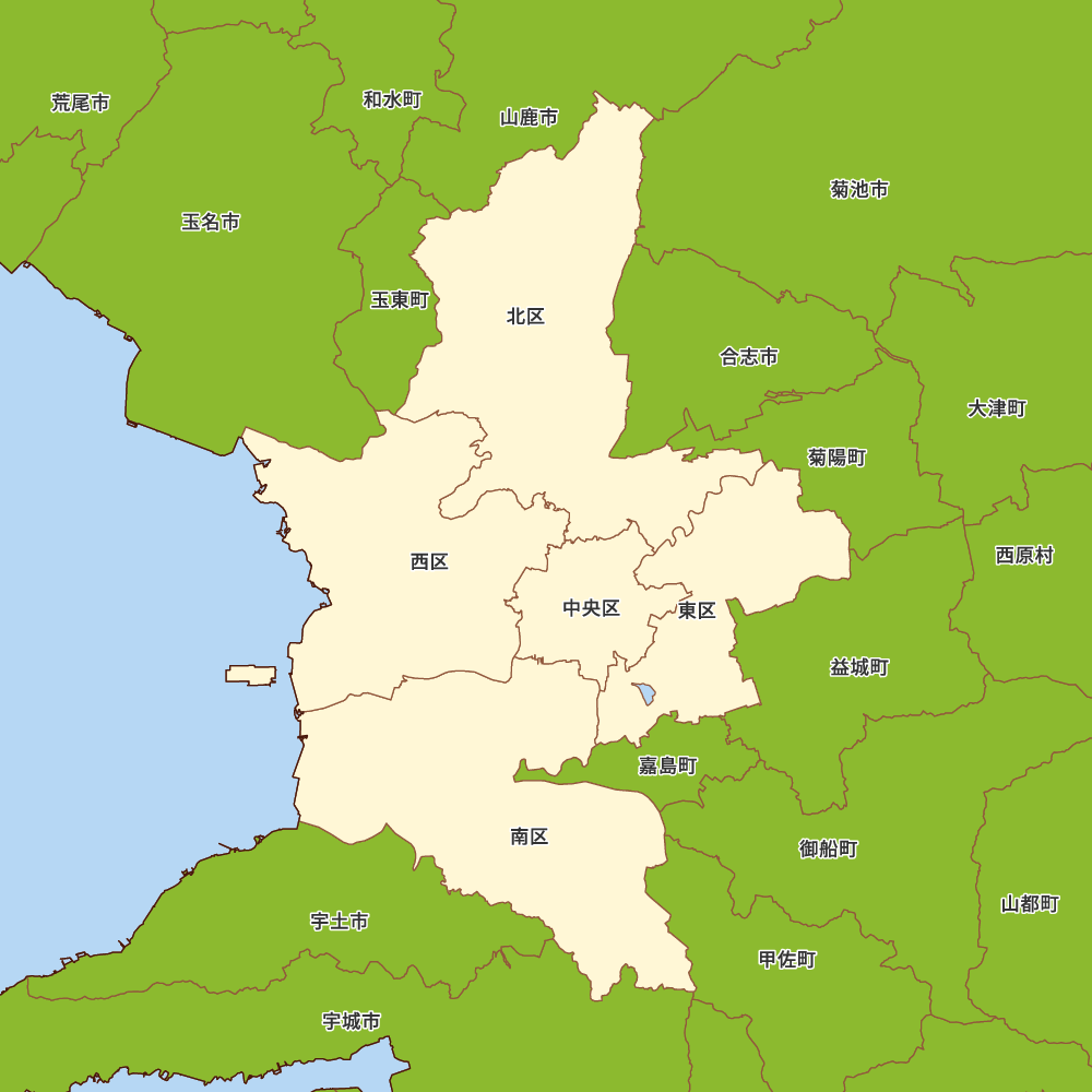 熊本県熊本市の地図を表示します。 マップ・イットは、地図素材や白地図が無料でダウンロードできるサイトです。印刷やWebなどの素材として商用利用できます。対応する地域は日本全域、八地方区分、47都道府県、政令指定都市、特別区、市町村です。