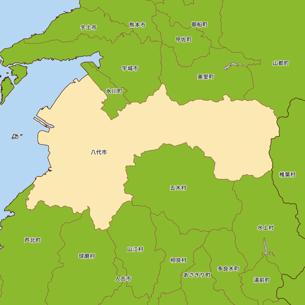 熊本県八代市の地図を表示します。 マップ・イットは、地図素材や白地図が無料でダウンロードできるサイトです。印刷やWebなどの素材として商用利用できます。対応する地域は日本全域、八地方区分、47都道府県、政令指定都市、特別区、市町村です。
