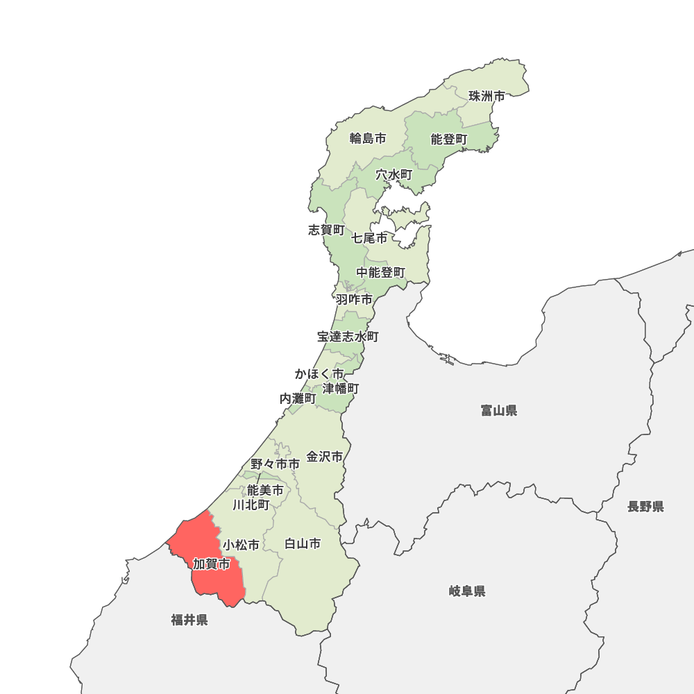 石川県加賀市の地図を表示します。 マップ・イットは、地図素材や白地図が無料でダウンロードできるサイトです。印刷やWebなどの素材として商用利用できます。対応する地域は日本全域、八地方区分、47都道府県、政令指定都市、特別区、市町村です。