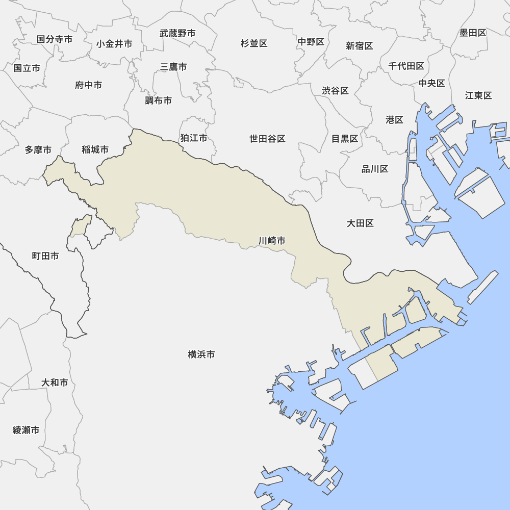 神奈川県川崎市の地図を表示します。 マップ・イットは、地図素材や白地図が無料でダウンロードできるサイトです。印刷やWebなどの素材として商用利用できます。対応する地域は日本全域、八地方区分、47都道府県、政令指定都市、特別区、市町村です。