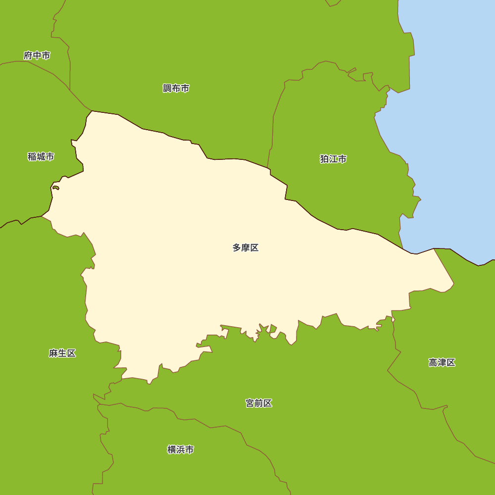 神奈川県川崎市多摩区の地図を表示します。 マップ・イットは、地図素材や白地図が無料でダウンロードできるサイトです。印刷やWebなどの素材として商用利用できます。対応する地域は日本全域、八地方区分、47都道府県、政令指定都市、特別区、市町村です。