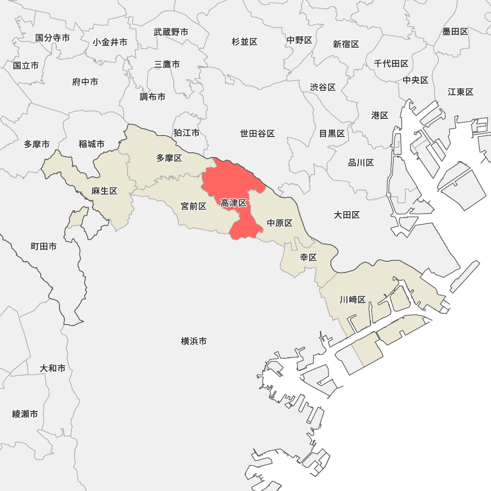 高津区は、川崎市を構成する7行政区のうちの一つである。溝の口駅・武蔵溝ノ口駅駅周辺を中心として東側の土地が主に再開発され、川崎市中部の中心商業地として発展している。