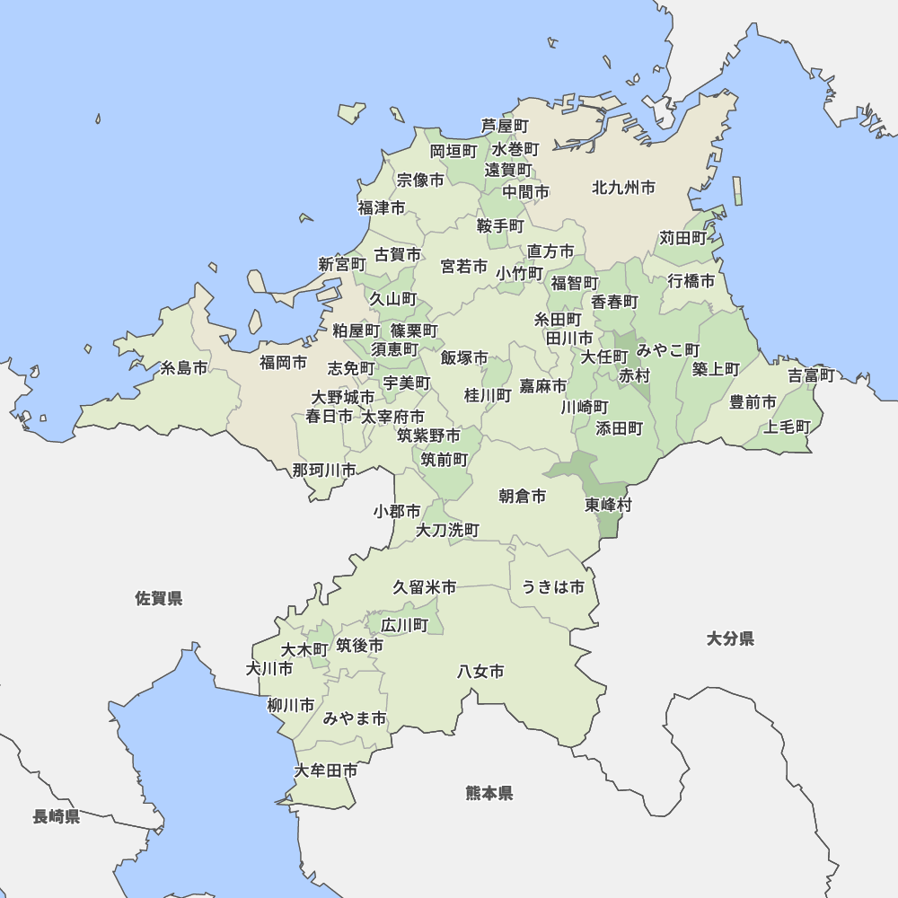 福岡県の地図を表示します。 マップ・イットは、地図素材や白地図が無料でダウンロードできるサイトです。印刷やWebなどの素材として商用利用できます。対応する地域は日本全域、八地方区分、47都道府県、政令指定都市、特別区、市町村です。