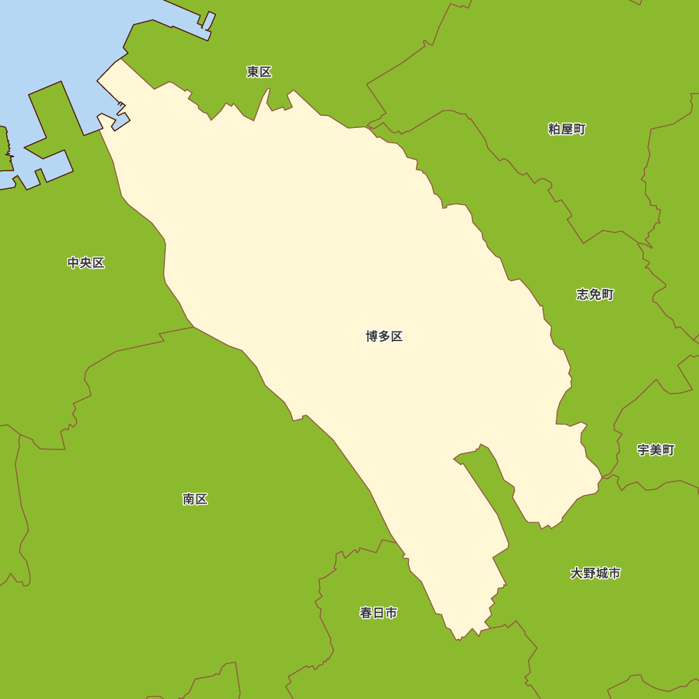 福岡県福岡市博多区の地図を表示します。 マップ・イットは、地図素材や白地図が無料でダウンロードできるサイトです。印刷やWebなどの素材として商用利用できます。対応する地域は日本全域、八地方区分、47都道府県、政令指定都市、特別区、市町村です。
