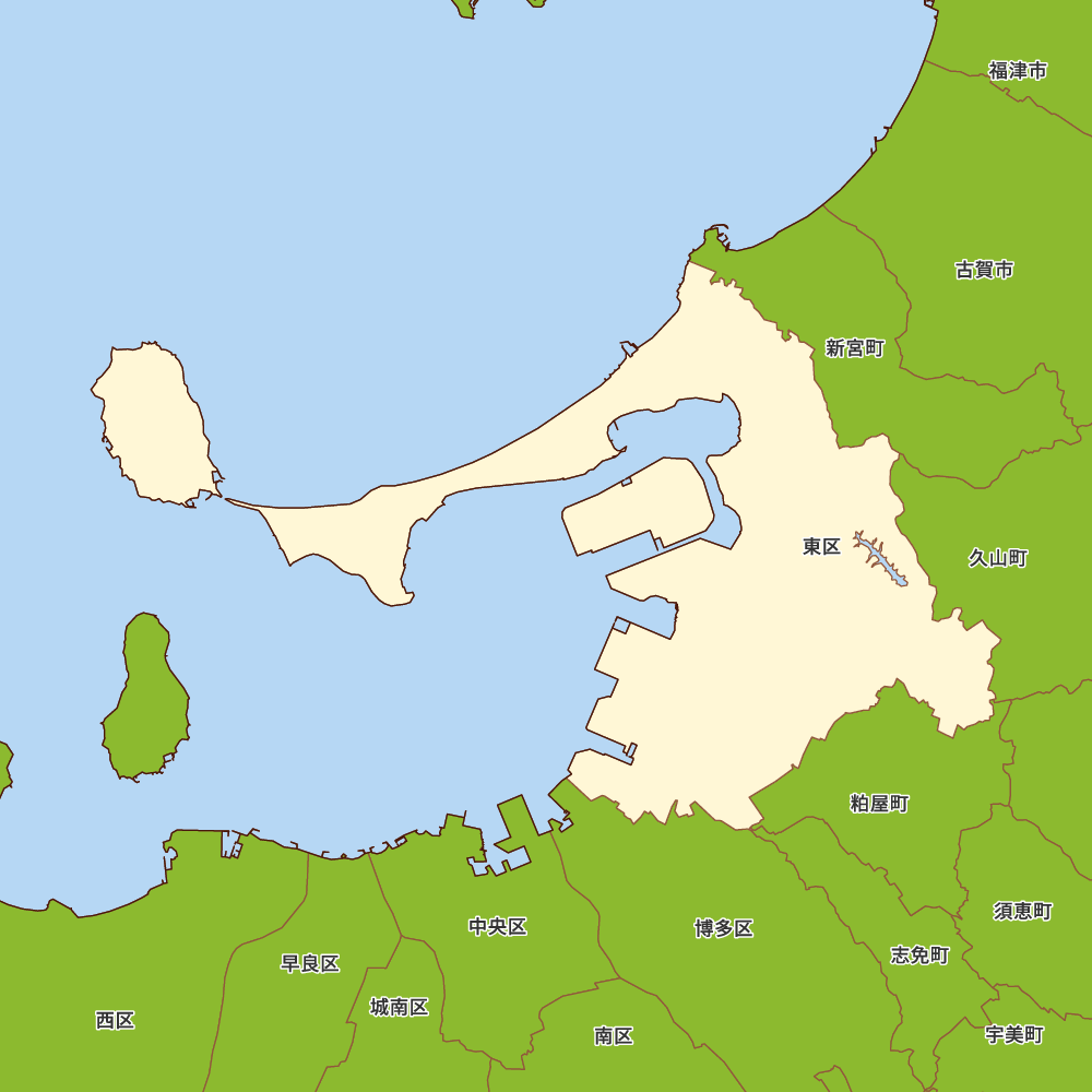 福岡県福岡市東区の地図を表示します。 マップ・イットは、地図素材や白地図が無料でダウンロードできるサイトです。印刷やWebなどの素材として商用利用できます。対応する地域は日本全域、八地方区分、47都道府県、政令指定都市、特別区、市町村です。