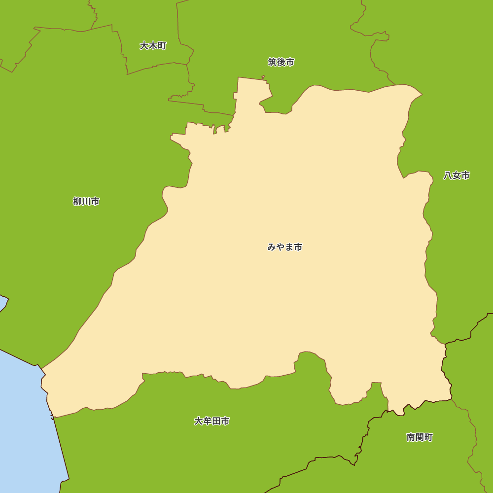 福岡県みやま市の地図を表示します。 マップ・イットは、地図素材や白地図が無料でダウンロードできるサイトです。印刷やWebなどの素材として商用利用できます。対応する地域は日本全域、八地方区分、47都道府県、政令指定都市、特別区、市町村です。