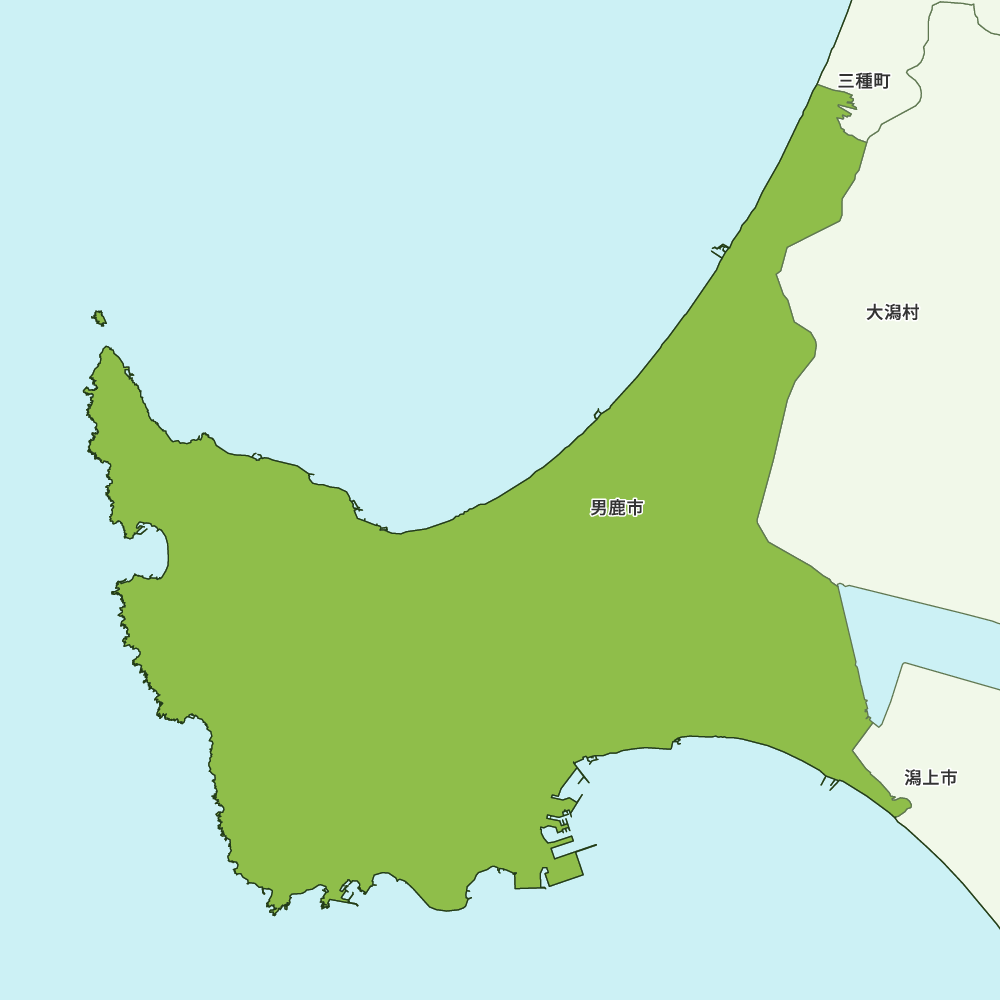 秋田県男鹿市の地図を表示します。 マップ・イットは、地図素材や白地図が無料でダウンロードできるサイトです。印刷やWebなどの素材として商用利用できます。対応する地域は日本全域、八地方区分、47都道府県、政令指定都市、特別区、市町村です。