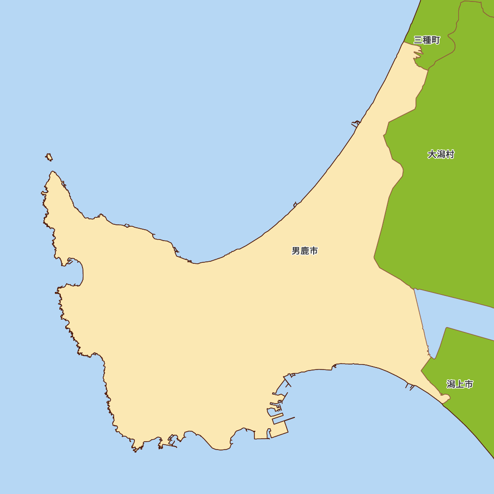 秋田県男鹿市の地図を表示します。 マップ・イットは、地図素材や白地図が無料でダウンロードできるサイトです。印刷やWebなどの素材として商用利用できます。対応する地域は日本全域、八地方区分、47都道府県、政令指定都市、特別区、市町村です。