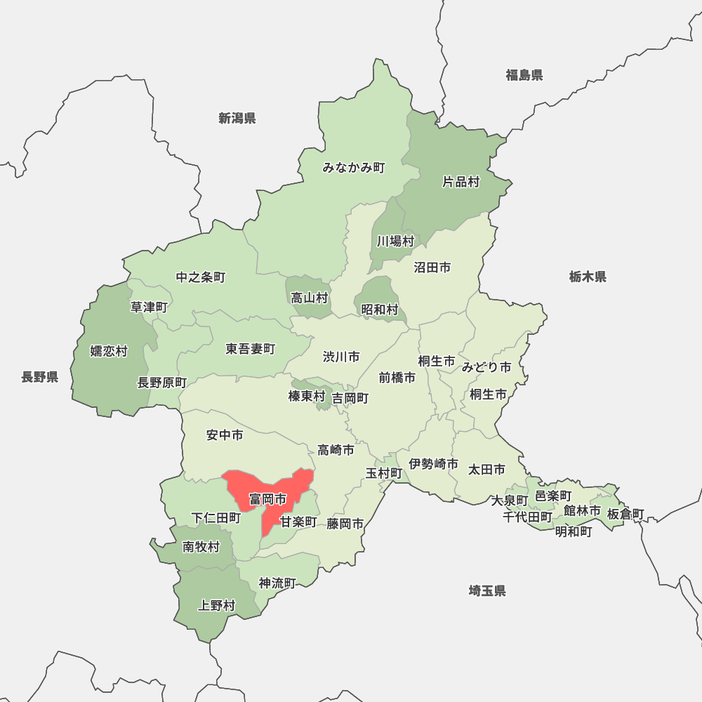 群馬県富岡市の地図を表示します。 マップ・イットは、地図素材や白地図が無料でダウンロードできるサイトです。印刷やWebなどの素材として商用利用できます。対応する地域は日本全域、八地方区分、47都道府県、政令指定都市、特別区、市町村です。