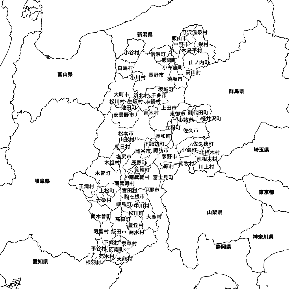 長野県の地図を表示します。 マップ・イットは、地図素材や白地図が無料でダウンロードできるサイトです。印刷やWebなどの素材として商用利用できます。対応する地域は日本全域、八地方区分、47都道府県、政令指定都市、特別区、市町村です。