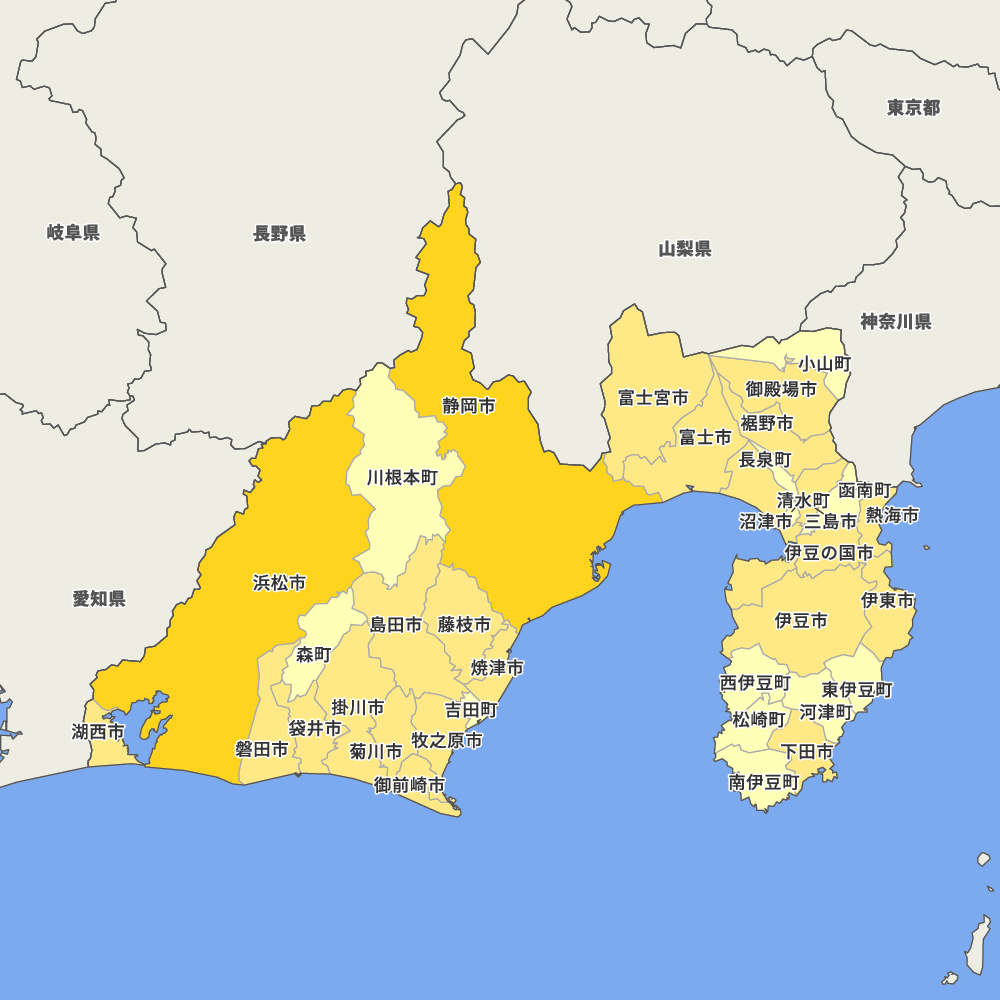 静岡県の地図を表示します。 マップ・イットは、地図素材や白地図が無料でダウンロードできるサイトです。印刷やWebなどの素材として商用利用できます。対応する地域は日本全域、八地方区分、47都道府県、政令指定都市、特別区、市町村です。