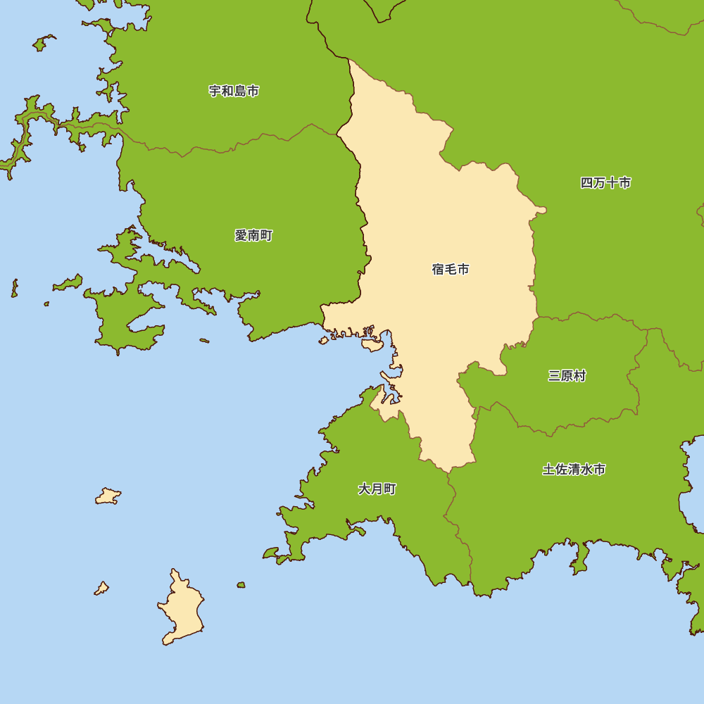 高知県宿毛市の地図を表示します。 マップ・イットは、地図素材や白地図が無料でダウンロードできるサイトです。印刷やWebなどの素材として商用利用できます。対応する地域は日本全域、八地方区分、47都道府県、政令指定都市、特別区、市町村です。