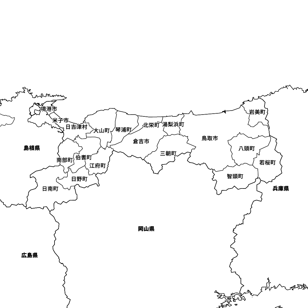 鳥取県の地図を表示します。 マップ・イットは、地図素材や白地図が無料でダウンロードできるサイトです。印刷やWebなどの素材として商用利用できます。対応する地域は日本全域、八地方区分、47都道府県、政令指定都市、特別区、市町村です。