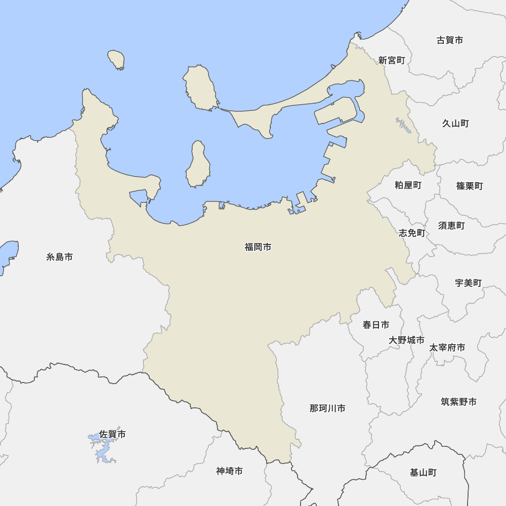 福岡県福岡市の地図を表示します。 マップ・イットは、地図素材や白地図が無料でダウンロードできるサイトです。印刷やWebなどの素材として商用利用できます。対応する地域は日本全域、八地方区分、47都道府県、政令指定都市、特別区、市町村です。